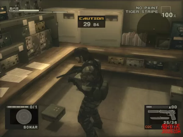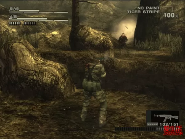 Boss一抖缰绳,纵马冲进了雨幕之中。 这时候回到操控Snake,这次降落的丛林和游戏一开始降落的丛林是一样的,在附近仔细寻找可以得到一些手榴弹、闪光弹、药物之类,趴下来用小刀攻击特殊的花草可以得到药剂,攻击小动物可以得到食物。 到达废弃工厂后注意,这里的露天二楼有一把AK47,如果离开地图再来这里还会刷出AK47的弹药。 附近仔细搜索一下还可以找到Snake躲藏专用的纸盒子A,地雷探测器等。 但是最重要的道具,还是索科洛夫房间柜子里的红外线热度感应器,这玩意儿是我们打很多BOSS必备的,许多喜欢躲躲藏藏的BOSS,包括The Fear、The End、The Boss都需要这玩意儿,没有它难度就会大很多。 燃烧的飞机残骸正好吸引了敌人的注意力,Snake沿着上次任务时的同一路线来到了RASSVET厂区。但是,当他按照情报在东北角的房间等待时,亚当却没有出现。Snake 走出屋外,随着沉重的摩托引擎轰鸣声,一道白光映进了他的眼睛。“对不起,我来晚了。”驾车的人戴着头盔,没法看清她的面目,但从声音和身材来看,那无疑是个女人。 “把引擎关掉,他们会听见的。” “你就是他们派来的特工?” “你是亚当?我以为你是个男的。” “亚当来不了了。” “好吧,说出你的暗号。爱国者是谁?”听见对方没有回答,Snake 提高嗓门又问了一遍。 女人还是没有说话。四周却闪出了好几个士兵的身影。 “趴下!”摩托上的女人叫道。Snake 应声扑向地面,这时陌生女人已经拔枪和士兵交上了火,几乎是弹无虚发地打倒了全部敌人。 “这就是你想要的答案。”她边说边摘下头盔,有意无意间随手拉开了紧身衣胸前的拉链。“我叫伊娃” 回到屋里,Snake 坐了下来,点起一支雪茄,“原来的计划并不是这样。亚当出什么事了?” “你的代号叫什么?” “……Snake” “而我是伊娃,你是来诱惑我的吗?”伊娃坐到Snake身边。 Snake往一旁挪了挪,“亚当怎么了?” “沃尔金上校是个多疑的人,他认为我比亚当更适合这个任务,”她笑了笑,“因为我能做到一些他做不到的事。” “你曾经是国安局的密码破译员?” “是的,4年前我和亚当一起逃到了苏联。” Snake的目光落在伊娃腰间的毛瑟枪上。“刚才那一手……你的枪法很不错。” “我猜你在西方是没见过吧,这是一把中国17式手枪。”伊娃得意地一笑,然后拿出了另一把枪。“这是给你的。” “.45吗,”Snake接过了这把做工异常精良的手枪,爱不释手地把玩起来,“太漂亮了。你从哪里弄到这样的好东西的?” “从西方的一座军火库弄来的。这本来大概是那些高级军官们的用枪。对了,你最好把这个也带上。”她扔给Snake一套研究员的白色制服。索科洛夫在北边的实验室里,那儿的防卫非常严密,你必须打扮成研究员的样子才可能混进去。” “我们有办法把他弄出实验室吗?” “试试看吧。”伊娃说道,她随即把前往实验室的路径详细地告诉了Snake “好,我们走吧……” Snake站起身来,但刚才在The Boss手下所挨拳脚和尚未痊愈的旧伤让他感到一阵虚弱。伊娃看出了他的疲惫。“你还是在这里休息一下再走吧!现在离黎明还有整整一个小时,夜里在丛林中乱闯是很危险的。”说着,她凑到Snake的面前,“我还可以为你做一点事……我会给你放哨直到天亮……” 天亮了,清晨的阳光照进了房间,Snake从睡梦中醒来,敏锐的耳朵立即捕捉到了一种谨慎热诡秘的脚步声。“不好,我们被包围了……”他透过窗户向外察看,发现了4名身穿GRU制服的士兵。 伊娃也看见了:“是山猫小队!我们要赶快离开!来,到这儿帮帮我,不要忘记你的装备!”两人把床移开,露出地板上的一道小门,从这里可以钻到屋子地板和地面之间的夹层。“等下我会开摩托突围,稍后再和你联络!”Snake点点头,“好,让我来拖延他们。” “别为我送命了,”伊娃在Snake颊上轻轻一吻,钻进了地道。 消灭了前来搜查的山猫小队,Snake 正要离开,却接连听见了几声枪响。他循声过去一看,竟然碰见了奥塞罗特,原来伊娃落入了他的掌握!和上次一样,奥塞罗特脸上依然挂满了傲慢的神气,但是手中的马卡洛夫手枪已经换成了一把精致的柯尔特的单动式陆军左轮。“没错,就是这个架势!”他居高临下,得意洋洋地冲Snake 说道。 伊娃试图挣脱,却被奥塞罗特一把抓了回来。“什么?是个女的?”奥塞罗特有点意外,“你!站着别动!”他看到Snake 正在慢慢挪动位置,立即大喝一声,“今天不会再出上次那种意外了,”奥塞罗特扬了扬手中的左轮。 “这枪确实很漂亮,”Snake不慌不忙地说,“可是要杀我你还差了样东西。” “什么!”奥塞罗特举起左轮,瞄准Snake扣动了扳机。击铁清脆地响了一声,却没有子弹射出。枪里已经没有子弹了!奥塞罗特刚知不妙,已经被伊娃转身一脚踢下高台。 伊娃打倒奥塞罗特,纵身跳上摩托,发动引擎,把再次扑上来的奥塞罗特撞了一个跟头,飞车驶到Snake身边。 “那玩意只能装6发子弹,”Snake对奥塞罗特说,“马卡洛夫是8发。这给你造成了一种错觉。” 奥塞罗特好不容易才从地上爬起来,拾起掉在地上的左轮,插回腰间的皮套。他倒退两步,“好,咱们走着瞧吧!”转身逃出了厂区。 伊娃因为要赶在奥塞罗特之前回到沃尔金上校的总部,随后也驾车离开了。 再次控制Snake前进,此时如果想要收集全64只青蛙就要往回走,详见专题链接,这边我们从废弃工厂后面的门继续前进。 下面是一片巨大的沼泽,有