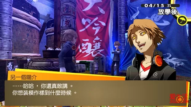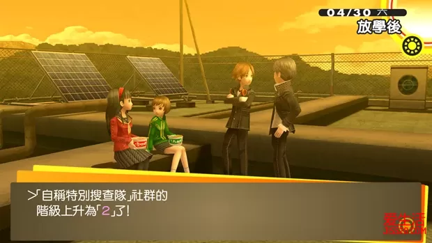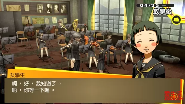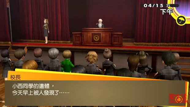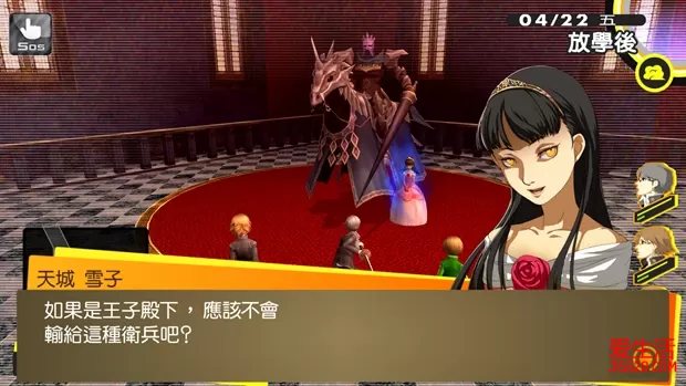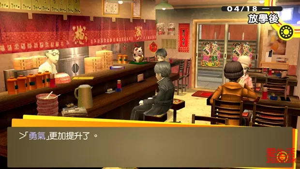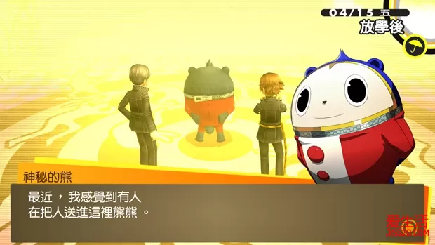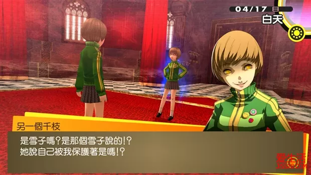 女神异闻录4黄金版一周目全社群等级MAX攻略/游戏评价/系统 4月 5月 6月 7月 8月 9月 10月 11月 12月 1月 2月/3月 愚者 魔术师 女教皇 女皇 皇帝 教皇 恋爱 战车 正义 隐士 命运 力量 倒悬者 死神 节制 恶魔 塔 星星 月亮 太阳 审判 小丑 永劫/世界 要点:①17日获得力量的人格面具“睡魔”。②22日获得魔术师、教皇、战车、正义、节制、恶魔和太阳的人格面具。③22日获得“堇青石”1个,以及“白桃果实”1个。④25日可以进行钓鱼。 4/11阴/雨 主角来到乡下的叔叔堂岛家,叔叔开车把主角接到小镇上,在加油站加了一下油,主角下车活动时,和加油站工作人员对话后,突然感觉有点不适,但也很快恢复过来。 开始在加油站附近可以自由行动一下,调查蓝色蝴蝶可以存档,与堂岛伯父对话可以继续进展剧情。晚上在家里可以自由活动,客厅的日历处可以存档,到2楼自己的房间,调查床垫直接睡觉。梦境中主角来到一个奇怪的地方,一路前进后与???战斗,5回合后战斗自动结束。 4/12雨/阴 主角进入当地学校成为一名转校生,在教室自我介绍时选择“谁是败逃武士啊!”,提升“勇气”。放学后可以利用自由活动时间熟悉一下街道设施的配置,不过什么都不能干就是了。 回到家里,和菜菜子看电视,发现新闻报道一个电视台的女主播死了,怀疑是因为出轨导致的。 4/13阴 上午上课提升“知识”。晚上进入自己的房间看深夜电视,发现自己居然会被吸进电视机里。 4/14雨 上午的问题回答“西元前1年”提升“知识”。放学后和同学探讨昨晚电视机上发现的异象,一同至朱尼斯的电视机销售柜台,三人居然真的被吸进电视机里,还在这里遇见了一只奇怪的小熊。在电视的世界中选择“没受伤吧?”提升“包容力”。 晚上回家从叔叔那里了解到一个叫小西早纪的女学生失踪了,她正是发现女主播尸体的人,而且小西早纪也是主角同学阳介暗恋的对象。之后直接睡觉。 4/15雨 一大早辽太郎又接到局里的电话匆匆出门。学校突然开了晨会,校长告知全体学生早纪的尸体在今早被发现,而且和山野主播相同,是以倒吊的方式被挂在电线杆上,学生之间一阵恐慌。 阳介说他昨晚也看了深夜电视,他看到早纪痛苦挣扎的身影,加上之前听过有学生在深夜电视看过山野主播的传闻,觉得这些案件之间一定有什么关联,因此想要再次进入电视的世界寻找答案 再次前往朱尼斯的电视机销售柜台,阳介带了一根绳子和主角进入电视机里的世界,对于阳介的问题选择“我比较担心千枝”提升“包容力”。再次遇到小熊,小熊告诉众人浓雾和电视世界的关联,之后进入“诡异的商店街”,进入早纪家的酒店,这里出现了另一个邪恶的阳介 击败阳介后回到家中,就可以使用△键打开菜单。选择回到自己房间就可以结束当天行动。之后剧情进入天鹅绒房间,社群系统开放。晚上在电视上会看到天城雪子的影像,原来女主播生前在雪子家的旅馆里住过,所以有雪子的采访记录 诡异的商店街 在这里迎来游戏的第一场正式战斗。敌人是“失言夸口者”×2,弱点属性是雷,利用SKILL“吉欧”可以造成倒地,然后以物理攻击将其消灭。 BOSS战阳介之影 弱点属性同样是雷,其在使用“蓄力”或防御后会使用“忘却之风”,造成主人公倒地,因此一定要防御。不断利用 SKILL“吉欧”将其打成倒地然后再攻击就好。 4/16雨 早上剧情获得社群“魔术师:花村阳介”。放学后发现天城雪子请假了,众人打电话给雪子,电话接通了,看来雪子目前没事。晚上叔叔和他的助手正在调查命案,回到家里直接看深夜电视,发现天城雪子居然出现在电视中,还提出要倒追白马王子。 4/17晴 在武器店购买装备后,进入天鹅绒房间。之后离开商店街,前往朱尼斯,然后剧情进入“雪子公主城”。 雪子公主城(初次) 与城门口的小熊对话可以获得道具,之后进入城堡。在迷宫探索时尽量先获得力量的人格面具“睡魔”,这是为了在后期的篮球社活动中升级,但如果真的没有刷出来也不要紧,按照我们的全Persona合成公式,去天鹅绒房间里合成也是一样的。 迷宫是随机生成的,在2F会遇到千枝的与BOSS“千枝之影” BOSS战千枝之影 BOSS的“玛哈吉欧”会造成阳介倒地,因此一定要在她用“蔑视”的下一回合让阳介防御。不过第一回合和濒死时会无前兆使用,因此尽量多多保存自身的HP。主人公配备伊邪那岐,使用“拉坤达”来降低BOSS的防御,然后让阳介用“加尔”攻击BOSS的风弱点。当BOSS使用“绿壁”时,会在两回合内变成风属性耐性,此时就用普通攻击打。注意利用好阳介的“迪亚”进行回复就能取胜。 BOSS战之后剧情获得社群“愚者:自称特别搜查队”。回到自己房间后发生剧情,之后与堂岛对话,然后前往商店街的加油站。领取道具后回到家中,结束今天的事件。 4/18晴 从这一天开始,放学后可以进行自由活动,走访各种各样的设施,为之后的战斗做好准备。到朱尼斯的美食街就可以前往电视世界。网络功能也得到开放。到4月29日为止,如果不能救出天城雪子,游戏将会GameOver。 早上会获得社群“战车:里中千枝”。下午的问题回答“Bet”提升“知识”。放学后前往商店街北部的爱家吃麻婆豆腐定食,提升“勇气”。晚上开始可以在堂岛不在的日子里外出,也可以利用自己房间内的物品。再次前往商店街北部的爱家吃麻婆豆腐定食,提升勇气 4/19晴/阴 在教学大楼1F尽头的