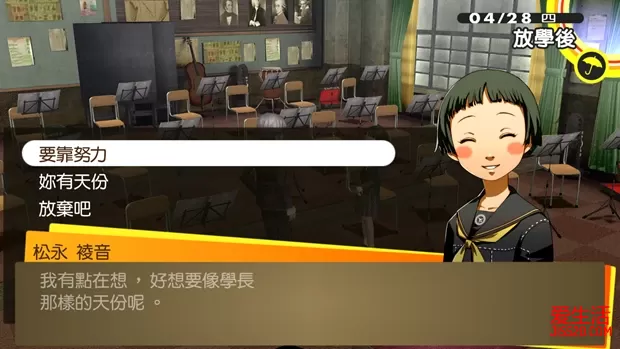 让一名角色进入恐怖状态后,一定要第一时间将其解除,否则下回合就会被“战栗的轮舞曲”造成大伤害。本战推荐人格面具为皇帝“奥伯隆”,耐火且持有电击,对付BOSS本体和王子都有不错的效果。如果觉得练级麻烦,火无效的女皇“仙狸”也是个不错的选择。 LV11出全体回复的“梅迪亚”,比“奥伯隆”要LV14来得更快。 击败BOSS后,刑警助手会告知众人雪子已经找到了 4/23阴 上课时选择“郁金香泡沫经济”提升与阳介的感情,以及“表达力”。放学后首先前往河堤与老爷爷对话,然后前往商店街北部的自动贩卖机购买“中元节果汁”,送给神社的捕虫少年,可以获得“龙姬瓢虫”。最后前往篮球社,选择“如果是我做得到的事……”、“只是运动罢了”、“包在我身上”,让社群“力量”等级上升至3。晚上在持有“龙姬瓢虫”的前提下前往商店街南部的紫路宫,选择“闲聊”和“交给她”,可以换取“鱼钩”和“面包屑”。然后回到自己房间,阅读《与众不同用功术》(3/3)。 4/24晴 拒绝一条的邀约,可以自由行动(尽量不要发展社群关系,但真发展了也没什么问题)。 4/25 上课时选择“超恢复”提升“知识”。放学后首先前往河边与老爷爷对话,可以获得“川钓竿” 以后就可以在这里钓鱼了。接下来前往实习大楼1F的音乐室加入管乐社,选择“帮忙”提升“包容力”,获得社群“太阳:松永绫音”。晚上调查自己房间里的沙发,阅读《出色的男子汉》(1/2)。 4/26阴 上课时选择“结婚数”提升与千枝的感情,以及“表达力”。放学后在持有“力量”的人格面具前提下,前往篮球社,选择“无法想象”、“太好了”,让社群“力量”等级上升至 4。晚上吃掉冰箱里的白味赠提升“勇气”。 4/27雨 首先前往商店街北部的家常菜大学,购买“特制炸肉饼”(获得奖杯)。回到学校教学大楼2F的图书室用功,提升“知识”。晚上可以前往武器店,有打折。之后在自己房间读书《出色的男子汉》(2/2)。 4/28雨 放学后前往管乐社,选择“要靠努力”、“在旁边看”,让社群“太阳”等级上升至2。晚上在自己房间调查书桌念书,提升“知识” 4/29雨 ※注意今天是救出雪子的最后期限。下午如果无法救出雪子,将会GameOver。白天在自己房间调查书桌念书,提升“知识”。晚上回到房间会自动观看深夜电视。 4/30晴 上午的课程中选择“水手号谷”,提升“知识”。放学后雪子回归,众人问她失踪的情景,但雪子说什么都不记得了。之后众人一同进入电视世界,雪子成为冒险的同伴,社群“愚者”等级提升至2。晚上在自己房间调查书桌念书,提升“知识” |