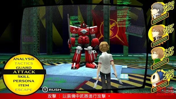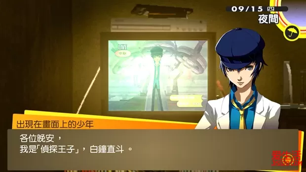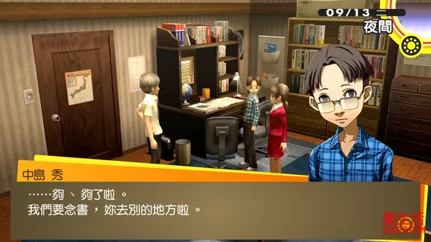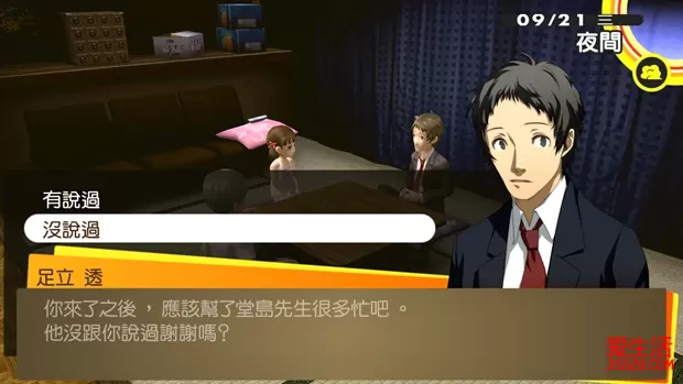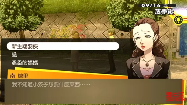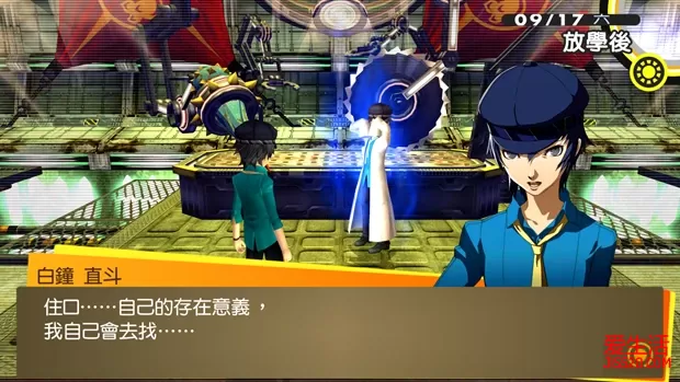 ②29日和30日晚上前往神社捕捉“稻羽玉虫”,用于在10月1日钓“川大王鱼” 9/1晴 白钟直斗转入八十神高校。上课时选择“牡丹肉”提升“知识”。晚上与菜菜子对话,随意选择,让社群“正义”等级提升至MAX。 9/2阴/雨 在图书室用功,提升“知识”。晚上在持有“恶魔”的人格面具的前提下,前往医院打工,让社群“恶魔”等级提升至8。 9/3晴 放学后与学校顶楼的女学生对话。然后前往教学大楼2F走廊与阳介对话,选择“真了不起”和“说得好!”,让社群“魔术师”等级提升至4。晚上在自己房间调查工作桌折纸鹤,提升“包容力”。 9/4晴 拒绝雪子的邀约。电视购物购买任意商品(解锁奖杯)。白天前往朱尼斯与阳介对话,选择“当然”和“快有了”,让社群“魔术师”等级提升至5。晚上先前往紫路宫与店主交谈,获得“面包屑”,用以9月11日钓起“红金”。然后回到自己房间,读书《钓鱼高手实用书》(2/3)。 9/5晴 上课时选择“气爽”可以增加“知识”。放学后前往顶楼与女生对话,选择“你好像想要改掉不擅表达的毛病”和“教她说话的方式”。然后前往安亲班打工,让社群“节制”等级提升至5。晚上先前往紫路宫与店主交谈,获得“面包屑”,用以9月11日钓起“红金”。然后在持有“皇帝”的人格面具前提下,与完二对话,选择“你去我才去”,提升社群“皇帝”的感情。 9/6阴/雨 前往商店街北部公布栏,应征“家庭教师”的打工。然后在持有“太阳”的人格面具前提下,前往管乐社,选择“主动告白”,让社群“太阳”等级提升至8,并与绫音成为恋人关系。晚上先前往紫路宫与店主交谈,获得“面包屑”,用以9月11日钓起“红金”。然后调查公车站,前去家教,选择“体育”,提升“知识”、“毅力”和“表达力”,获得社群“塔:家教学生”。 9/7晴 放学后前往顶楼与女生对话,选择“有时也需鼓起勇气道歉”,完成任务12。然后在持有“月亮”的人格面具前提下,前往教学大楼1F走廊与爱对话,选择“没关系”和“因为是朋友”,让社群“月亮”等级提升至7。晚上要准备修学旅行,无法自由活动。 9/8晴 修学旅行第一天。小熊的社群“星星”等级提升至5。 9/9晴 修学旅行第二天。国王游戏时选择“3号来紧紧抱住我”提升雪子的感情。 9/10晴 修学旅行第三天。选择“去买岩户台灯笼”可以提升菜菜子的感情。回家后选择“下次全家一起去”可以再次提升菜菜子的感情。 9/11阴 电视购物购买任意商品(解锁奖杯)。前往朱尼斯与阳介对话,选择“小事一椿”和“你真成熟”,让社群“魔术师”等级提升至6。晚上先前往紫路宫与店主交谈,获得“面包屑”。然后前往河边用“面包屑”钓鱼,至少钓起一条“红金”,用以完成9月17日的任务13。 9/12 上课提升“知识”。放学后在持有“节制”的人格面具的前提下,前往安亲班打工,提升社群“节制”的感情。晚上没有自由活动。 9/13晴 放学后在顶楼与千枝对话,选择“没错”和“那当然”,让社群“战车”等级提升至6。晚上在持有“塔”的人格面具的前提下,前往家教打工,第二、三项选择“反过来对秀说明”和“今天到此为止……”,让社群“塔”等级提升至2。 9/14雨 放学后前往神社报告任务12完成,让社群“隐士”等级提升至7。晚上看深夜电视,发现直斗的轮廓。 9/15 没有自由活动,看深夜电视,直斗果然出现在电视中,显然美津雄并不是真正的凶手。 9/16雨/晴 首先前往实习大楼1F走廊与女生对话,再前往商店街北部与警察对话,接下来找河边的千枝对话,最后再前往商店街北部与警察对话。然后前往神社接受任务13“想习惯猫”,到河堤与男人对话,选择“猫?”,接着来到堂岛家门前调查猫,依次选择“摸”和“还是算了”。再次调查猫,选择“带他来”。最后在持有“节制”的人格面具前提下,前往安亲班打工,最后一项选择“新生翔羽侠”,让社群“节制”等级提升至6。晚上在持有“恶魔”的人格面具的前提下,前往医院打工,提升社群“恶魔”的感情。 9/17晴 上课选择“40分钟”提升“知识”。放学后前往商店街南部与警察对话,选择“抱持异常的执着”和“把他当成小孩子”,达成开启新迷宫“秘密组织改造研究室”的条件。在持有“红金”前提下,与河堤上讨厌猫的男性对话,选择“让他看”。之后前往电视世界,攻略新迷宫“秘密组织改造研究室”。“VOID QUEST”的新BOSS也不要忘记去做掉。前往天鹅绒房间,依次合成带有“梅迪拉玛”的倒悬者“八房”(Lv49),公式为皇帝“图特”(Lv47:梅迪拉玛)×倒悬者“欧特鲁斯”×倒悬者“真神”×太阳“那罗辛哈”×隐士“天蛾人”;以及带有“提特拉康”的星星“象头神”(Lv50),公式为愚者“单卡拉比”(初期持有)×塔“库夫林”。完成后社群“女皇”等级上升至9。 VOIDQUEST(逃避之兵) 跟杂兵版“钢铁巨兵”不一样,这个BOSS并没有四属性和万能耐性,所以选择以魔法攻击为主的同伴吧。雪子最好也带上,因为它会使用混乱与激昂的状态攻击。“污秽吐息”→“姆多翁”很容易致死,因此中了“污秽吐息”后最好是进行防御。击倒后“勇气”提升,调查斗技场的骷髅图案可以获得“盖亚之剑”。 秘密组织改造研究室(直斗救出),时间限定:9/17~10/5 BOSS“直斗之影”带有火耐性,如果没有打消火耐性的技能,就最好不要上雪子,不然只能作为回复要员。另外它的物防较低,因此上物