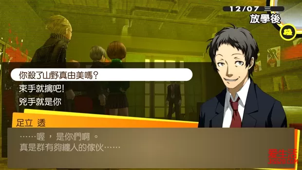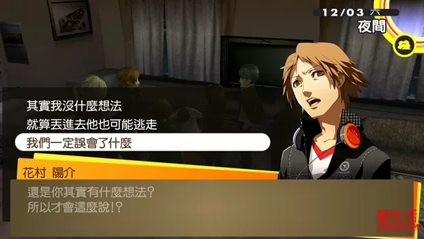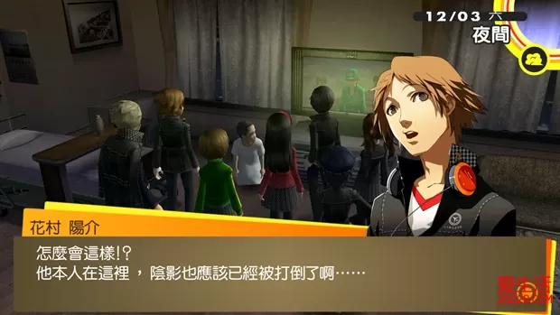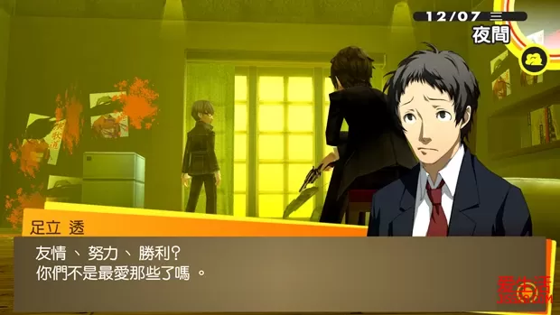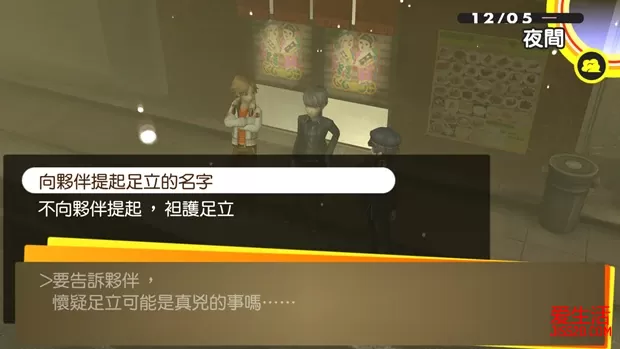 女神异闻录4黄金版一周目全社群等级MAX攻略/游戏评价/系统 4月 5月 6月 7月 8月 9月 10月 11月 12月 1月 2月/3月 愚者 魔术师 女教皇 女皇 皇帝 教皇 恋爱 战车 正义 隐士 命运 力量 倒悬者 死神 节制 恶魔 塔 星星 月亮 太阳 审判 小丑 永劫/世界 要点:①晚上标注的自由行动时间,全部用来读书,直到获得相关奖杯。②23日接受邀约,24日会发生圣诞节事件。③12月25日~1月9日无法发展社群。 12/1阴 依次选择“不属于任何国家”和“费式数列”。 12/2阴 依次选择“百岁兰”和“鱼板”。 12/3阴 期末考试结束。※此时系统会提示存档,建议在这里存档一次,关系到之后的结局分歧选项。 大雾到依然没有散去,众人放学后到朱尼斯讨论。警方正在对生田目进行调查,但电视中发生的事情也没有办法作为证据。突然,主角接到足立打来的电话,菜菜子的病情恶化了,所有人赶快冲到医院,但医生完全束手无策,只能看着菜菜子弱小的身躯渐渐失去心跳以及呼吸,大家陷入一片沉默 这时足立透露生田目就在这家医院的一个房间,众人便立刻冲过去,一进病房就看到精神混乱跪倒在地的生田目,并且刚好现在在播出深夜电视,画面出现了生田目阴影,他嘲笑就算抓到了他也不能安下任何罪名,他还是会继续进行「救赎」。 这边依据玩家的选择会走向不同的结局,走真结局,主角会阻止激动的阳介,因为事件仍有许多疑点,刚好医生和足立冲进来,把所有人赶出去。 直斗重新整理事件,发现生田目没有杀人动机,而且当时也有不在场证明。突然护士跑过来,告知大家菜菜子的心跳恢复了,所有人赶快到病房查看,虽然还没脱离危机,但总算可以放下心中的大石,大家离开医院准备回家,这才发现小熊不见了,阳介表示他回家看看。 晚上在生田目的病房里的选项,关系到最终结局走向。选择“把他丢进电视”或“离开这里”都会进入Bad Ending 1。选择“等一下”后的选项错误会通向Bad Ending 2。依次选择“等一下”→“还有些事情尚未理清”→“生田目真正的想法”→“总觉得有什么不对劲”→“我们一定有什么误会”→“冷静点!”才会通向Normal Ending、共犯Ending或真Ending。 社群“愚者”等级提升至MAX,获得社群“审判:追求真相的伙伴们”。社群“小丑”等级提升至8。 12/4阴 选择“恐吓信的内容”,让社群“审判”等级提升至3。众人再次去找生田目,了解到生田目真正的动机,原来,他从另一个角度看到了电视里的异常,他发现,只要推一个人进电视,电视里的前一个人就不会被杀,但他并不知道,电视里的前一个人是主角众人救下来的,生田目是出于好心而不是杀人。 12/5阴 ※建议先存档一次,关系到之后的结局分歧选项。 去镇上寻找线索,询问众人对最初的凶手有没有印象。先前往商店街北部与神社前的女性对话,选择“关于春天的事件”,再次与她对话,选择“关于可疑人物”,然后与商店街北部的防毒面具男、大嗓门的老人和上班族对话,打听“关于春天的事件”和“关于可疑人物”,接下来前往朱尼斯向女学生打听这两个选项,再前往河堤上向笑容可掬的男人和老人打听这两个选项。最后前往商店街南部,与阿姨和女学生打听这两个选项,完成后自动进入爱家发生剧情,之后选择“足立透”,雪子突然想到,山野主播来他们家旅馆住宿的时候,为了不被狗仔打扰,警方有指派人力驻守,而保护主播的人正是刚转职到小镇的足立透,一切的线索都接上了。 这里会进入结局分歧选项:选择“向伙伴提起足立的名字”将进入Normal Ending或真Ending;选择“不向伙伴提起,袒护足立”→“即使如此仍要袒护足立”将进入共犯Ending。 选择“向伙伴提起足立的名字”的情况下,确定进入Normal Ending或真Ending,社群“审判”等级提升至5,社群“星星”等级提升至MAX。 共犯Ending 依次选择“去见足立一面”→“是你做的吗?”→“不是”→“不是”→“我是站在你这边的”→“知道”一“点火烧掉恐吓信”。与足立的小丑社群度直接达到MAX,解禁“祸津伊邪那岐”。之后游戏结束,继承存档后重开二周目,可以合成“祸津伊邪那岐”。 12/6阴 大家到医院去找足立对峙,足立动作很快的将生田目移送,之后开始装傻,但在激烈的辩论中,不小心说出了把人推进去这个词,事迹败露的他只好逃走,大家在医院里找了老半天,最后有可能逃去的地方只有电视里面。 小熊的人格面具进化,社群“审判”等级提升至6。 12/7阴 社群“审判”等级提升至8。晚上选择“1个人去找他”,社群“小丑”变为社群“欲望”,这是在进行真Ending的情况下解禁“祸津伊邪那岐”的必要条件。 12/8阴 期末考试成绩公布,学校全部社群感情提升。新迷宫“祸津稻羽市”开放。攻略该迷宫后时间会自动进展到12/23,因此在22日再去攻略。放学后前往管乐社,让社群“太阳”等级提升至MAX。晚上自由行动,建议读书。 12/9阴 上课选择“透明”提升“知识”。放学后在持有“恋爱”的人格面具前提下,与理世对话,选择“因为“小理世”也是理世”,让社群“恋爱”等级提升至9。晚上自由行动,建议读书。 12/10阴 上课选择“剖面”提升“知识”。放学后与千枝对话,让社群“战车”等级提升至MAX。晚上自由行动,建议读书。 12/11阴 前往河边与久乃对话,第二项选择“信真不方便”,让社群“死神”等级提升至6。晚上自由行动,建议读书。 12/12阴 在持有“命运”的