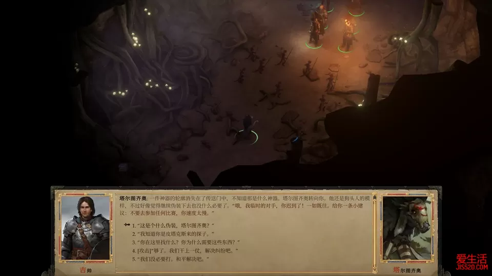 游戏评价/序章 踏上荣耀的第一步 第一章 失窃之地(1) 第一章 失窃之地(2) 第二章 巨魔之乱(1) 第二章 巨魔之乱(2) 第二章 巨魔之乱(3) 第二章 巨魔之乱(4) 第三章 开花季节(1) 第三章 开花季节(2) 第三章 开花季节(3) 第四章 瓦恩领失踪事件(1) 第四章 瓦恩领失踪事件(2) 第四章 瓦恩领失踪事件(3) 第五章 重生的军阀(1) 第五章 重生的军阀(2) 第五章 重生的军阀(3) 第六章 河流诸王之战(1) 第六章 河流诸王之战(2) 第六章 河流诸王之战(3) 第七章 无尽哭号之声 第八章 被诅咒的国王 进入老法桐,首先是会和我们的老朋友,领主嘉曼蒂的守卫队长凯斯腾碰面,他也是来追踪塔尔图齐奥的,领主已经发现他是间谍,并且洗清了我们的冤屈,可惜此行他并没有找到人,答应协助凯斯腾追踪塔尔图齐奥,他就会回贸易站等我们的消息。 深入老法桐,会发现这里的狗头人和另一群叫做螨怪的生物正在大战,原因似乎是狗头人夺取了螨怪的某种圣物,这里可以选择协助螨怪,也可以选择协助狗头人,当然,也可以选择两边都不帮,全部干掉。经过验证,两边都不帮是经验值最多的选择,咱们的攻略就选择这条路线,如果帮助任何一方,在老法桐洞穴里还有几段不重要的小剧情。 既然两不相帮,那就没什么可说的,一路见到什么就杀即可。注意老法桐地面有以下几个重要的地方。 首先是地图中央高地,高地左边是一片月莱菔菜地,一群狗头人倒在月莱菔菜地里,似乎在嗑药一样,任意选择,即可获取月莱菔,这是贸易站里博肯所需要的第二种植物,这时候就可以随时回去交这个任务了。中央高地另一边是一个独特怪物,击败它可以获得翡翠,周围还有些隐藏道具。 注意,这个游戏一共有45个独特怪物,全部打完最后可以进入孤单的坟冢魔法门,在本攻略里全部都会提及,正常按照攻略打就能找齐,最后打开隐藏地图 然后是地图左下角、地图右下角,两个地方都有需要技能判定才能进入的隐藏地点,里面有宝箱,锁住的宝箱需要技能检定才能打开。 地图下方有个火堆营地,这里的螨怪和狗头人和睦相处,它们会给一个小任务,击杀狼群的头领格拉鲁克,狼群的头领在地图右上角,狼群头领同样会给我们任务,让我们去杀人,不用理会,干掉他们就好,可惜回来交任务发现并没有经验值,只有一点金币。 地图左上角有一个野营地,野营地周围全是死尸,在野营地中间可以选择休息,但千万不要这么做,因为睡到半夜,会有一个强力精英怪斯穆尔德伯恩子爵,这家伙的实力可不是初期队伍可以碰瓷的,第二章之后再来打会比较轻松一点。 此外,地图中央右侧有一块地方有很多陷阱,解除这些陷阱,发现前方是个人类土匪营地,这些土匪正在睡觉,他们中威胁最大的是那个法师,让菜刀队冲到法师面前再攻击,可以轻松解决它们。最后,也是最重要的,地图右下方,有狗头人守护的老法桐洞窟入口前,有一个尸体,尸体里有烧焦的项链碎片(3/7),千万不要遗漏。 现在老法桐地面就算全部探索完毕了,我们可以从狗头人的入口进入老法桐洞窟。老法桐洞窟比较复杂,有两层,还好难度不高,值得注意的是刚进入的通道里有很多陷阱,一定要多记录,因为每解除一个陷阱都是一份经验。 稍微深入一点会遇到一个狗头人守着的平台,点击平台会进入文字冒险,通过检定就可以解除这个陷阱。 之后可以向右边走,这里有好几个狗头人的营地,最深处还有狗头人酋长,干掉它们,可以获得螨怪的圣物,不过我们选择的路线是两边都敌对,所以没用。前面一个营地还可以救出跟随塔尔图齐奥的另一名队友,哈瑞姆或者耶萨尔其中的一个,无论是谁,本章他都不可能加入了,会先回到贸易站去养伤。 之后可以在一个需要技能检定的地方跳到下一层,可以找到一个矿工的杠杆,这个杠杆可以用来推动洞窟第一层地图左边的一辆矿车,矿车滑下去会砸开一条路,进去后可以捡到说书人神器烧焦的项链碎片(4/7)。 继续在这片洞窟的上下两层探索,很多路都是相通的,这里还有些强大的精英怪,包括一个巨大的蜘蛛,这个蜘蛛前面有个等级较高的蛛网陷阱请注意。另外还有个巨大的蜈蚣,这些蜈蚣的攻击在高难度下会降低队员的敏捷属性,很麻烦。 洞窟的上半部分是螨怪的地盘,这里可以干掉螨怪的女王,女王后面通向一个巨大树藤的门,打开门之后就会遇到本地图的小BOSS,塔尔图齐奥,建议先别急着打,这场战斗还是有点难度,我们继续把老法桐探索完,休整后再来打它。 老法桐深处还有几个重要的地点没说,首先是右上角,在一个巨大蜘蛛尸体的场景,有烧焦的项链碎片(5/7),这个场景下方有很多植物的区域还有隐藏房间可以搜刮,有个全是蛤蟆的房间,里面有个金蛤蟆,但是直到游戏通关都不知道这个金蛤蟆有啥用。 然后是老法桐深处的左上角,这里的有个小机关,首先让两名队友分别踩在地面石板上,然后让第三名队友触摸墙壁上的开关,就能打开一扇隐藏门,里面会出来三个精英骷髅怪,实力不俗,请上满BUFF再开战。 找齐以上的地点,就可以离开洞窟休整一下,然后从螨怪女王后面的通道进去,找到塔尔图齐奥了。此刻的他正在试图获取这里的某种圣物,看到我们到达,立刻叫出大量狗头人,注意,我们的背后还会出现两个狗头人,建议留个肉盾在后方。 干掉塔尔图齐奥之后,就可以离开这里了。遗憾的是,当队伍离开洞穴时,一段动画显示,有人来到塔尔图齐奥的尸体旁,复活了