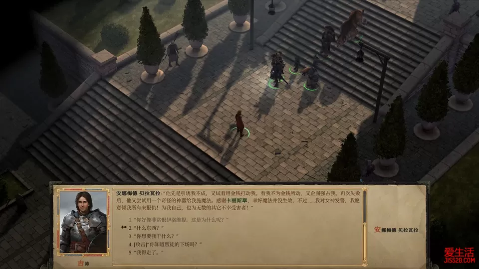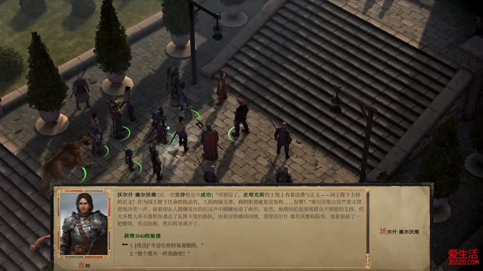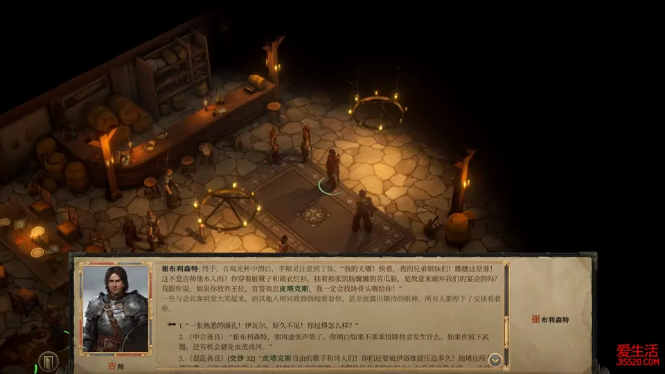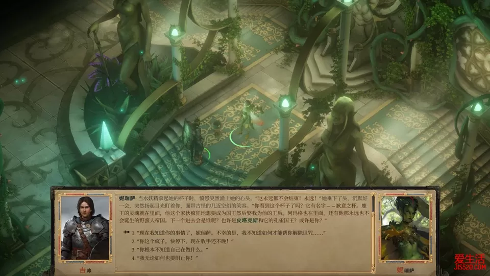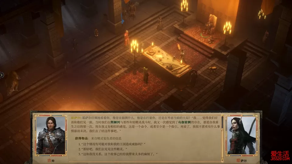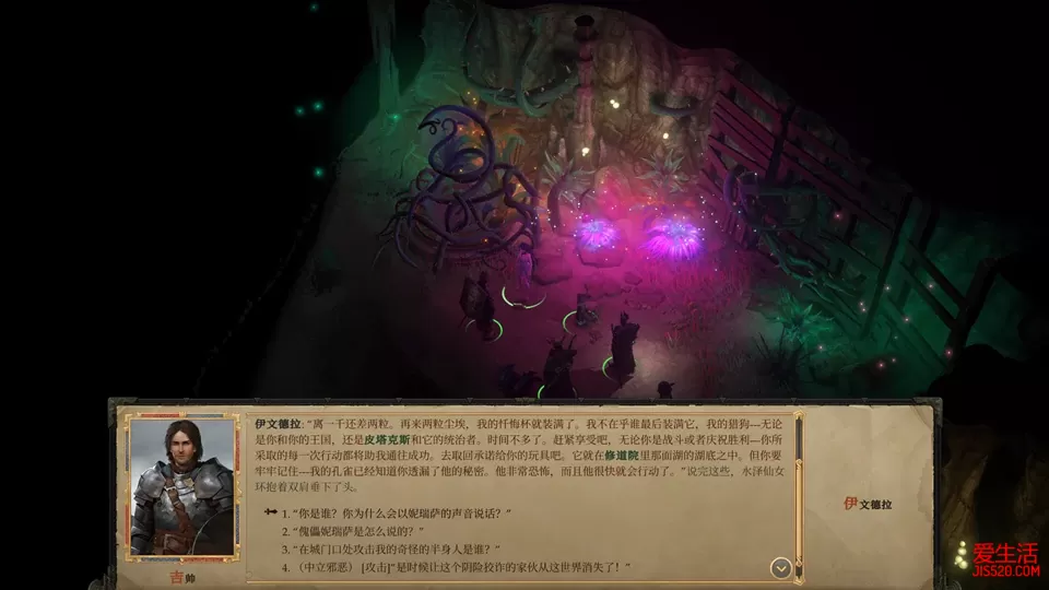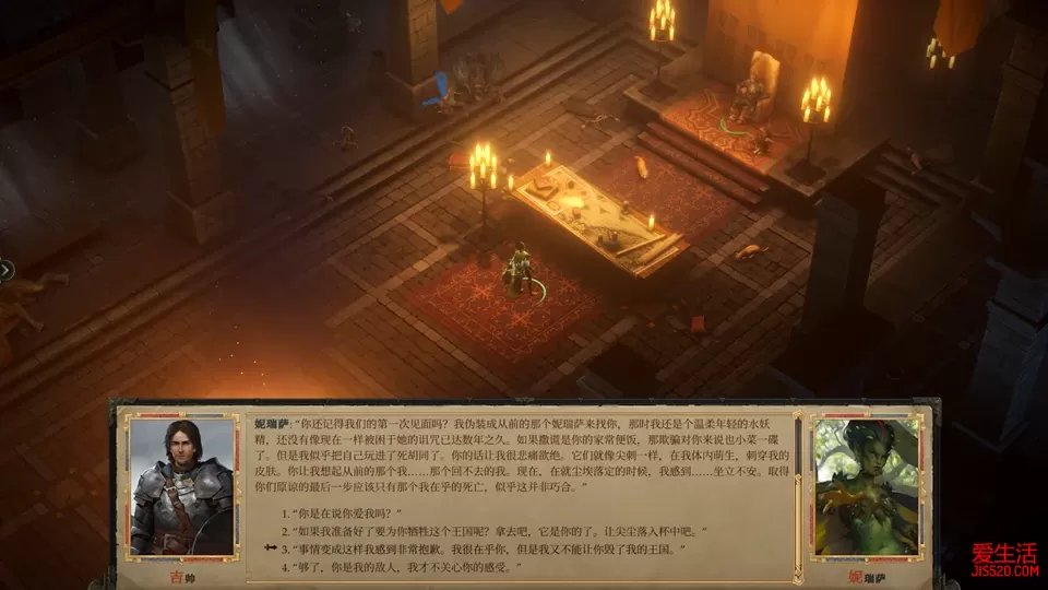 游戏评价/序章 踏上荣耀的第一步 第一章 失窃之地(1) 第一章 失窃之地(2) 第二章 巨魔之乱(1) 第二章 巨魔之乱(2) 第二章 巨魔之乱(3) 第二章 巨魔之乱(4) 第三章 开花季节(1) 第三章 开花季节(2) 第三章 开花季节(3) 第四章 瓦恩领失踪事件(1) 第四章 瓦恩领失踪事件(2) 第四章 瓦恩领失踪事件(3) 第五章 重生的军阀(1) 第五章 重生的军阀(2) 第五章 重生的军阀(3) 第六章 河流诸王之战(1) 第六章 河流诸王之战(2) 第六章 河流诸王之战(3) 第六章 河流诸王之战(4) 第七章 无尽哭号之声(1) 七章 无尽哭号之声(2) 第八章 被诅咒的国王 下面就是解决邻国的破坏组织。一路往南,直到在河边发现一个马戏团驯兽地点,这个地图不大,主要的敌人是巨魔,需要注意的是上方右侧有个天陨铁碎片(10/17),地图最右侧的栅栏门里有个侏儒,就是风马牛辩论会里找麻烦的那家伙,干掉他,也算是报仇了。如果打不开这个栅栏门的锁,可以从下方的洞口用运动检定进去。地图左边还有两个巨魔,应该是艾昆达尤的仇人,选守序善良干掉他们。 解决巨魔骚乱之后,西北方还有个叫刀刃河营地的地方,这里是河盗的地盘,进去把河盗全部清理光,注意右侧山头上还有两波河盗。其中一个河盗最后会求饶,建议选择守序善良杀了他,因为本章后期有一个检定需要守序,多积累一些守序的数值。 接下来去皮塔克斯河湾北面的利特顿,这里是散播谣言的源头。进去后果然发现地上有大量谣言传单,都是在这里印制的,把这里的人都干掉,然后进入左侧的酒馆。 酒馆里有一个老熟人,第三章出现过的狼人伊瓦尔,还记得吗?当时特别说明不要杀了他,就是为了今天的见面。用交涉32的检定说服伊瓦尔站在我们这边,全灭敌人后,再和伊瓦尔对话,可以获得第14个诅咒,伊瓦尔 这样皮塔克斯国王对失窃之地的骚扰就全部解决了,不过别着急去找皮塔克斯国王伊洛维提,先去左下角的嬉笑岭,这里有极饿女王任务的最后一块石碑,按照下图的位置摆放,皇后就会出现,选择混乱邪恶的答复,皇后会赠送一套强力装备,给瓦尔瑞用最合适 同样在这张地图里,右上角的尸体有一个天陨铁碎片(11/17)。也同样在这张地图里,左边有个传送门,里面有个独特怪红帽子,别漏了。 在探索的过程中,很有可能会遇到一个随机事件,一个哥布林在路上卖主角的王座,说服它或者买回王座,失窃的王座任务就会完成。 还是不着急去皮塔克斯做主线,而是回城,管理一下王国,升级一两个数值,等待林翠和说书人研究尼瑞莎的梦境。在升级一次数值的时候,耶萨尔很有可能会来汇报,她想去追踪自己的精灵营地,和那些精灵见一面,答应她然后陪她一起去,这是耶萨尔最后一个个人任务了。 目的地就在西边的精灵营地,地图上已经标好了,进去后发现一个惊人的事实,领头追杀耶萨尔的就是耶萨尔的女儿诺特拉拉,而耶萨尔也很过分,要献祭自己的女儿给女神,难怪这对母女不对付。用交涉36的选项说服诺特拉拉,可以获得大量经验,然后干掉所有精灵,再反过来说服耶萨尔放过自己的女儿,又能获得大量经验值(接近三万) 两头经验值吃完,母女终于和解,但耶萨尔的女神也降下了惩罚,把耶萨尔劈成了碎片。直到游戏最后通关前,我们是再也见不到耶萨尔了。 回主城,如果尼瑞莎的梦境还没有研究好,就再升级一次主城的数值,直到尼瑞莎的梦境研究完成,和说书人对话,就可以进入尼瑞莎的梦境,林翠会和主角一起进入梦境中。 在梦境里,会看到最初的尼瑞莎是个和邪恶斗争的好人,选你们说的是哪个王国?会得知尼瑞莎被灯王诅咒,逼她毁灭一千个王国。 灯王这里的动画开始重复后可以和尼瑞莎对话,一定要选择看到你这个样子,我的心都要碎了……嗯…… 进入宫殿后,要选择你的仁慈呢?你的灵魂呢?接着选择需求善良的选项,如果跟着攻略走此刻肯定是善良阵营。 进入文字冒险,选择自己变成蓝色的妖精,林翠变成一个飞舞的墨水瓶,然后用魅力检定成功,建造一条通向天空的阶梯,见到被困的尼瑞莎,选择不要屈服,不要绝望。 离开文字冒险,进入内殿,会看到从第一章开始,尼瑞莎是如何煽动鹿王、崔斯提安、阿玛格、伊洛维提这些人与主角为敌的,可以看出,尼瑞莎是从头到尾以来,在背后操纵一切的幕后黑手。 之后的对话里,选择了解了这一切,但不知道该如何帮助尼瑞莎解除诅咒,尼瑞莎会说出一个叫白玫瑰修道院的地方,选择好吧,我这就去看看,就可以离开尼瑞莎的梦境了。 这个白玫瑰修道院就在地图的西面,已经标记好了,直接去就行。进去后会遇到陷阱和大量的敌人,还好修道院非常小,很快就能到最里面,击败一个园丁,打破水钟,救出一个叫伊文德拉的仙女。伊文德拉是尼瑞莎的表姐妹,也是尼瑞莎用来控制这些国王的传声筒,目前距离尼瑞莎毁灭一千个王国还差一两个了,无论是毁了伊洛维提的皮塔克斯,还是毁了主角的王国,都是尼瑞莎想要的结果。之后伊文德拉想要留在主角的王国,虽然瓦尔瑞会反对,但一定要选择同意,这关系到隐藏结局。 离开之前先潜水找几个宝物,然后离开白玫瑰修道院,再次回城。这个修道院下面的分支路线通向最终独特怪,一条龙,建议18级以上再来打。回城之后,皮塔克斯王国的使者前来挑衅,直接把他怼回去 然后所有人突然昏倒,尼瑞莎出现了。(如果刚刚没有放过伊文德拉,这里尼瑞莎就不会出现)。和往常一样,对话时不要