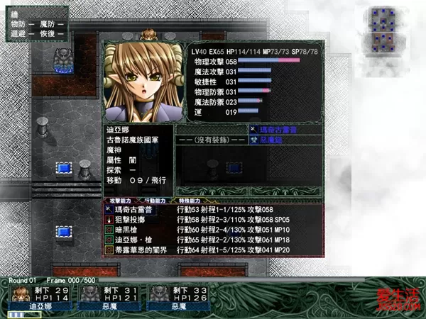 王都米鲁斯(访问) 选项:“冲出去攻击姬将军”--伊莉娜忠诚度+4;“默默守候”--无事 访问灵腐之间时,选择“给予腐食的炼液”,艾莉卡娜忠诚度+3,以后会得到道具,不给就无事发生 罗多城砦(战斗) 拒绝和恶魔迪亚娜同盟的场合就会进入本关 敌人数量很多,右侧独木桥会有大量敌人涌过来,提前找个防御力高的去堵桥口,其他人沿着河边防御,阻止敌人的飞兵过河,注意,敌人出生点的援军攻击力很高,如果没有把握,还是尽早占领河这边的出生点,以免腹背受敌 干掉城砦中央的哥布林头领后,进入下一阶段,地图周围出现两个强力的尸龙,左下角则是最终的BOSS恶魔,在城砦附近埋伏恶魔,只要击败恶魔即可过关,至于两个尸龙,拥有两个攻击力极高的范围魔法,实力不行的话不要勉强。 地图左上角有隐藏宝物,右上角有隐藏房间 过关之后菲叶加入成为队友 托拉库鲁遗迹(战斗) 本关右边有个蓝色的门,必须用锡蒙力之门钥匙才能打开(盗贼也可以),里面是合成材料珍珠钢 起始位置左下角有隐藏房间,里面的道具是恶魔铠,中间下方有一个很长的隐藏通道,里面有三个宝箱,左上角有隐藏房间,里面是合成道具。右下角有隐藏道具是宝石箱,上方左边有隐藏房间,里面是月鳞皮衣,中间的拐角处有隐藏道具,下方是隐藏房间,里面有两个宝箱,上方中间凹陷处是隐藏房间,里面是剑亚那托斯,中间回蓝据点左边有个隐藏道具 尼诺城市(和迪亚娜同盟的场合) 本关的敌人全部都是弓箭手和魔法师,不但攻击力强,而且地形方面有飞行结界,这个对我主的飞行人员很不利,所以我主出击人员应以地上部队为主,敌人都是有两格以上攻击范围的,进攻时不宜太快,应逐个引出来打,小心敌方的飞行精灵和水精有大范围魔法,干掉BOSS之前记得先把其后面的宝箱捡了。 [过关之后菲叶成为侧室] 这关的道具:风之纹章、月星石、水星石、土星石、精灵弓、天王石×2、虹色的星石、秘银、海王石、哈米斯里艾库、琥珀宝石、宝石箱、妖精王之衣、铠之秘文、金锤、治愈之水大、英雄颈环 新地点<背德之塔>出现 背德之塔(战斗) 拒绝同盟后,和迪亚娜的最后一战,本关中获取隐藏道具的话,在击败迪亚娜后可以收为侧室 看起来敌人好像不多,但据点后面都是隐藏房间,里面全是敌人,一旦占领据点,这些敌人就会出现,上2楼的楼梯在中间的隐藏房间,建议把所有隐藏房间探完再继续上楼 重要道具黄金甲罗在背德之塔2楼,右边悬崖上探索,要飞兵去捡,对面的同样位置是隐藏道具光之纹章 第三层会遇到BOSS迪亚娜,迪亚娜的难度不算低,如果李维三转的话会简单一些 如果刚刚找到黄金甲罗,战后就可以选择用黄金甲罗再度封印,迪亚娜成为侧室 剧情选项:(本攻略选"进攻米雷提亚保护领",LAW路线) "进攻米雷提亚保护领"--以后蒂法妮亚会加入 "进攻斯利吉王国"--以后萨莉埃努、里欧涅会成为侧室 米雷提亚国境附近(战斗) 本关的目的是敌全灭或敌据点全部占领,达成其中一个都会过关,这里的敌人全都是待机防御的,不过一但我方向其中一个发动攻击的话它周围的人都会主动围过来,加上蒂法妮亚发动了古代兵器的关系,在地图上每250frame都会发生一次陨石魔法,虽然攻击力不大,但攻击范围超广,一定要注意回复,还有那几个飞龙骑士,最好先引出来处理掉。最后BOSS方面由于其身边有不小兵还有一个回复魔法师,不容易对付,活用地图魔法的关键,地图上四个角落里的森林都有隐藏宝箱,记得去拿 这关的道具:海王石、奖章、治愈之水小×2、治愈之水中、冥王石、火之纹章、魔力石小、水之纹章、月星石、迅速护身符、金块、暗之纹章(スタート地点下の森のへこみ)、木星石(它左边的空地)、守护秘文(右上のへこみ)、治愈之水大(中央上のへこみ)、姫神的手环右(左下の高い木)、斗士的鳞石(姫神的手环上方的灌木)、腐食的炼液(左边的空地)、金星石(左上端) 加西玛山(战斗) 这个场景需要完成妮娜的访问剧情后才会出现 地图左上角、道路边缘有:大治愈之水,山中被山岳与荒地包围、只有一格是地面的地方(树下)有:土星石,从那里往下数第7格有守护秘文,敌人会掉落暗之纹章、风之纹章。 山中的宝箱是一把剑迪沃提鲁,地图左下角、旗帜左下方进入森林里的隐藏房间,宝箱里是神兽利爪 贝斯提城市(战斗) 开始时要注意左右两个魔法师,处理之后就可以向上攻了,最好可以迅速占领上向的两个据点,不然的话每个回合那里都会出两个飞龙骑士出来的。打BOSS之前注意其身后有三个飞龙骑士,最好可以先引出来干掉,BOSS蒂法妮亚能力可是高得惊人,数值跟随我方平均等级的升高而更高,还有两格的攻击范围 为了避免与其硬碰,用地图魔法或距离超过三格的法术攻击,三转魔法暗黑枪对其有特效,幸运的是,蒂法妮亚一般不会移动。 这关有两个门一定要用钥匙才可以打开的,左下角和右下角都有隐藏道具,在左边锁了门的一个小屋里可以找到一个"会员证",有了这个过关后就可以进入隐藏商店了 [过关后蒂法妮亚加入] 这关的道具:天王石、木星石×2、琥珀宝石、风之纹章、水星石、治愈女神的圣手(スタート地点左の键付き小屋)、金块(左下端)、魔术师的炼液(右下端)、斯诺拉里艾库、加鲁米斯、古路提姆(右の大きい键付き部屋)、木星石(その右の小さい键)、格拉尼斯、砦之戒指、秘银铠(左の大きい键付き部屋))、会员证 