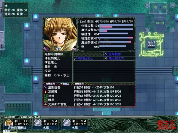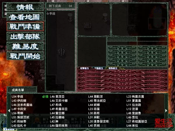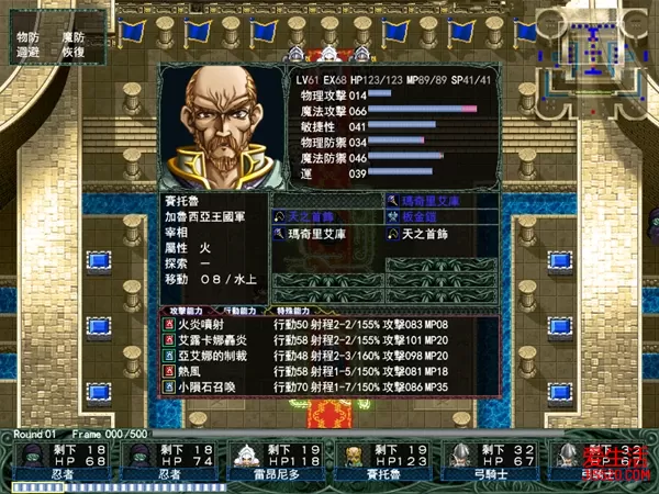 普罗诺斯城砦(战斗) 这关有三个要点:1、我方起初地点对面的水龙是会主动攻过来的,而且每个回合还会在据点增加两只,由于地形和敌人分布问题,我方不大可能正面攻过去,比较可行的方法是从下面绕过去。2、从第二个回合开始左下角的据点就会有飞龙兵出现,会对我方造成威慑,一定要尽快占领。3、城右下方有一个开关,打下之后对应的桥就会出现。总结以上三点,我方应要兵分两路,一队在原地打水龙,一队从下面攻过去尽快占领据点,打下护城河的桥。之后打水龙的那队就可以通过桥去汇合了。 这关BOSS回避力很高,最好找弓箭手等命中高的人去打。地图左上角,右上角,右下角,和下方桥前树林中的空地,还有左边的山里都有隐藏道具。 这关的道具:奖章、魔力石中、月鳞皮衣、铠之秘文、月星石、百战戒指、加速护身符、魔导手西利鲁、将军颈环、治愈之水大、火之纹章、法鲁马鲁斯、木星石(右上端)、魔力石大(右下端)、暗夜的鳞石(左上端)、SG-7(真ん中左の白い山)、斗士的鳞石(下の桥手前の森のへこみ) 刺客弑神者(战斗) 这关虽然我方只有艾库莉亚和吉鲁提因两个人,不过敌方人数比我方还要少,只有赛利卡一个,战斗方面由于吉鲁提因能力明显比赛利卡差上很多,所以实际上这场战斗只是艾库莉亚和赛利卡的一对一对决。开始时先用艾库莉亚捡左边宝箱里的补血药,然后绕到右上方把另一个宝箱里的补血药也拭捡掉,最后站在上方的据点里等赛利卡上来和他面对面打,如不出意外的话在用理两个补血药之后就可以胜出,有一点要注意的,这关无论输赢都可以过关,只不过赢了多一张CG,输了可就没有了。 贪欲之间(战斗) 这关的特点是当我方人员走到两个石像之间时相对的门就会打开,纵向和横向的石像之间都会有反应,开门后有道具、敌人和获得队友等不同结果,所以建议把每一个石像之间都走一遍 下方有个门里有宝箱,打开宝箱后希娃露提亚会加入 这关的道具:风之纹章(雷龙掉落)、神兽利爪(左上端)、比鲁里菲(在下方打不开的门右侧6格处有隐藏房间)、克莉丝提涅(将敌人全部消灭后,打不开的门会打开) 尤利耶城市(战斗) 一开始敌人就会主动地攻过来,我方只要在原地作防守战就可以轻松将敌人一一消灭,打完之后再向下攻,小心每个回合从据点出来的飞龙兵,尽快干掉之后占回来。这关的BOSS除了会一招地图魔法之外没有什么特别之处了,派几个防高的人上去就可以搞定过关。左上角,左下角,右下角的森林和城左上方的森林里都有隐藏道具。 这关的道具:断裂软膏、魔术师的炼液、魔法金属全身铠、冥王石、英雄颈环、金星石、火星石、巴拉提姆、起点上方半被树木包围的地面上是魔法石,金星石(画面上の丘の中央)、土星石(その左下)、冥王石(その左上)、月星石(右下の森のへこみ)、金块(城の左上の森のへこみ)、防护秘文(出撃地点左の丘、宝箱の右上) 王都卢库西亚(战斗) 地图中央有飞行结界,我方只要是会飞的人都无法通过,包括几个法师和四转的主角李维。所以应兵分两路从两边的门向上攻,顺便可以拿回忍者所偷走的道具,然后再在中央汇合,再攻上去。 这里有个难点,由于先击倒雷昂尼多可以得到攻防4上升的饰物的,反之先击倒赛托鲁再打雷昂尼多的话就会直接过关,道具就得不到了,但地图上方有五个据点,每个回合都会出现五个敌方援兵,持续四个回合,所以耐心打完四个回合之后再考虑向上进攻 赛托鲁魔攻很高(跟随玩家等级),又会大范围的陨石魔法,而且站在雷昂尼多的前面,要在这样的情况下绕过赛托鲁上去打雷昂尼多是十分困难的,鉴于赛托鲁的攻击力非常高,建议让高防队员引诱塞托鲁攻击,直到耗尽其魔法值,然后找四个高防角色围住他,再慢慢进攻雷昂尼多 隐藏道具方面,两边水池中间的平台和王座后面那个有黑点的墙里各有一个。 这关的道具:月星石、土星石×2、治愈之羽、魔力石小、宝石箱、深红的胸铠、火之纹章、法鲁马鲁斯、风之纹章、魔导铠里库斯、米亚斯石、木星石、斗技石中、治愈之水小、治愈之水中×2、炽天使之衣、玛奇里艾库、天之首饰、比鲁戒指、巴拉提姆、玛利亚之心(雷昂尼多を先に倒せれば)、咒锻的鳞石(左上の阶段近く、水に囲まれた场所)、制裁的鳞石(同上右上阶段近く)、玛露欧恩的手环(雷昂尼多の玉座左上の壁) 野望之间(战斗) 本关类似于是男人就下一百层,如果有耐心的话可以在这里玩很久,本关没有任何道具。站在熔岩上会受到持续伤害,重复选择选项「继续深入」可以直到最底层。中途退出的话,下次会从该进度继续。敌人在98层之前为随机出现,99层:随性来访的男子(赛莉卡),100层:魔人布莱亚德 ver1.00:二周目以后会从上回继续的层数开始;若已通关过,则从100层开始。ver1.02:二周目以后也从1层开始。 米斯梅鲁树塔(战斗) 必须有里欧涅才能进入这一关,也是完美LAW结局的必须条件 入口处:虹色星石;起点右侧宝箱:破术秘文;从此处向上 7 格、向右 2 格:虹色星石 右上角宝箱:虹色星石;从此处向下 3 格、向左 2 格:虹色星石;其左侧墙壁有光点处的隐藏房间有宝箱:西格莱昂 起点左侧宝箱:暗之纹章;从此宝箱向上 5 格、向右 5 格:虹色星石 中央宝箱:左侧:虹色星石;右侧:卡纳托恰斯特;从右侧宝箱向上 5 格、向右 3 格:虹色星石 上方宝箱:破术秘文;从此处向左 5 格:虹色星