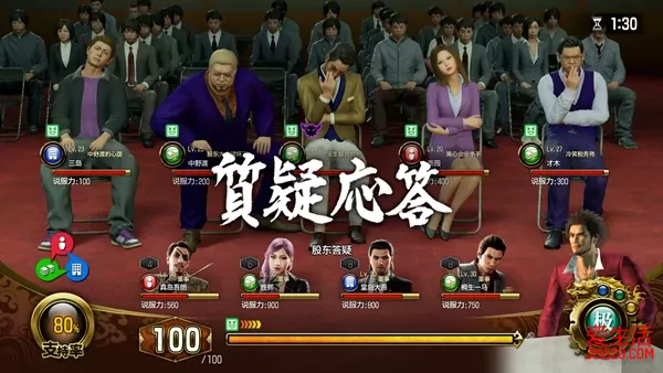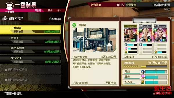 公司经营 在第五章触发支线故事“异人町的容身之处”就会触发“公司经营”了,这个小游戏的赚钱速度很快,是玩家发家致富的最佳选择,而且挺好玩。 不过在实际开始认真经营之前,还是建议先去完成一些支线故事,获得一些公司人才,此处推荐支线故事“罪与罚”,完成这个支线故事会奖励员工“花山选手”,这是一个能够从头用到尾,经营和股东大会都无所不能的强力员工。当然,如果直接选择DLC赠送的一大批UR级员工,那就无所谓了 公司经营的流程分为两部分:经营和股东大会。每四次行动算是“一期”,前三次为经营,系统会根据玩家当前的不动产盈利能力来产生利润,利润会转换成经营资金,玩家再利用这些经营资金来提高自身的盈利能力。三次经营结束后便是股东大会,玩家需要“战胜”股东,不让自己的支持率降到0。 不动产 经营部分虽然看似很复杂,但实际上就是一个数字游戏。简单的公式如下:销售规模=所有不动产的销售规模总和,支出=所有不动产的维护费总和+人事费+其他费用(贷款还款、广告费等等)。 不动产是所有盈利的基础,要想提高不动产的盈利能力,玩家只需要关心销售规模。只有规模上去了,不动产的盈利能力才会上去。除了规模,每个不动产都有三个属性:商品、服务品质和知名度。玩家需要配置相应能力的员工,使得三个员工的能力总和达到三个属性的最低要求。 只有在销售规模最大化,并且配置合适的员工,不动产的盈利能力才能达到最高。 然而很多时候由于员工数量和质量的问题,玩家有时候并不能满足不动产的属性要求。遇到这种情况时玩家也无需过于在意,实际上只要不动产配置了一位员工,那么该不动产就能盈利。满足属性要求的最大作用是减少负面效果的出现概率,让利润最大化。话虽如此,从大数据来看,中后期那一百来万的波动实际上可以忽略,“员工不足”的玩家可以随便安排一个员工进去先应付一下。 不动产可以提升的等级,其中投资后三项可以提高对应属性的初始值,让玩家只要配置能力弱一些的员工即可满足要求,而销售规模可以提高盈利能力,但与此同时也会提高不动产对于三个属性的要求。 早期盈利能力最强的不动产就是初始的一番制果,盈利远超前期其他任何不动产,最具投资价值 随着流程推进,玩家可以购买的不动产种类和数量也会增加。玩家需要及时将盈利能力跟不上的不动产换成价格更高、盈利能力更强的企业。游戏会不断出现随机事件,其中部分事件会导致某个特定种类的不动产盈利能力变强,但可遇不可求,玩家无须过于在意这个而贸然改变自己的不动产配置。另外不动产的升级是会一直保留下来的,即便玩家将其出售也是如此,随着等级的提升,不动产的售价也会提升。 员工 员工在经营部分的作用很大,配置合适的员工在不动产中可以最大程度地提高其盈利能力。和不动产类似,员工也有同样的三个属性。除此以外,不同的员工还对应不同种类的不动产,配置到合适的不动产会有一定的加成,但效果不明显,建议玩家直接忽视。 除了初始员工以外,员工的获得方式有三种:完成支线故事、和街道上的指定NPC对话并满足其要求和随机。这部分加入的员工都能在人事管理中的“录取新人”处看到并花费签约金来获得(部分特殊角色不需要签约金,例如里里佳等和春日一番有”亲密关系“的女性)。值得注意的是,虽然角色有稀有度和签约金的设定,但这些实际上和角色好不好用没什么关系,玩家还是根据自己的需要雇佣员工吧。另外随机登场的员工,其稀有度和玩家当前公司规模相关,稀有度越高,那么他们在公司规模还小的时候出现率就越低。 将其配置到股东大会的出席人员,或者不动产,那么随着时间推移,员工的等级会慢慢提升,当然玩家也可以花费金钱快速提高员工的等级。等级提升的同时还会提高能力,等级到一定上限后玩家就需要让员工升职才能继续提高等级。随着职位变高,员工的薪水也会变高。员工还有士气的设定,越高越好,嫌麻烦的玩家可以直接使用自动关怀来快速关怀所有员工,无论在什么时候,士气保持最高值总是最好的。 除了经营,员工还有一个重要作用,那就是帮助玩家应付股东大会的股东,而这就涉及到员工的另外三个能力以及股东大会。 股东大会 股东大会的核心在于迅速回复发言成本,进而可以多次发言,和发言成本回复速度相关的是员工的状态,因此在进入股东大会前,一定要让员工处于最佳状态,并尽可能提高员工等级,以增加员工发言的攻击力。 进入股东会,玩家的目标是在保证在时间限制结束之前,将自己的支持率保持在50%以上。而提高支持率最好的办法便是将股东们一一反驳,股东会轮流发言,并针对其中一位员工发言。玩家可以主动出击,也可以等到股东烦躁量表满了之后再发言。如果玩家没有反驳成功,那么员工就会受到伤害,HP掉光员工就会丧失战意,不能继续发言,全部员工丧失战意的话同样也会使股东大会失败。 除了其对应属性(红、蓝、绿)员工在股东大会上的属性有三种:其中说服力代表攻击力,斗志为HP,发言成本则是发动攻击时所需耗费的“费用”。前两个很好理解,玩家的总费用会随着时间慢慢回复,费用不够的话员工就不能发言而只能白白挨打。 一次成功的攻防互换的简单流程为:股东发言→玩家反驳成功→股东陷入硬直,玩家趁机攻